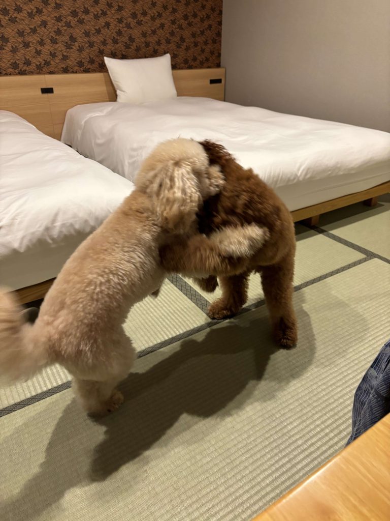 飼い主たちが温泉行ってる間は2匹で仲良くうまうまもらってお利口にお留守番できたよ🐶